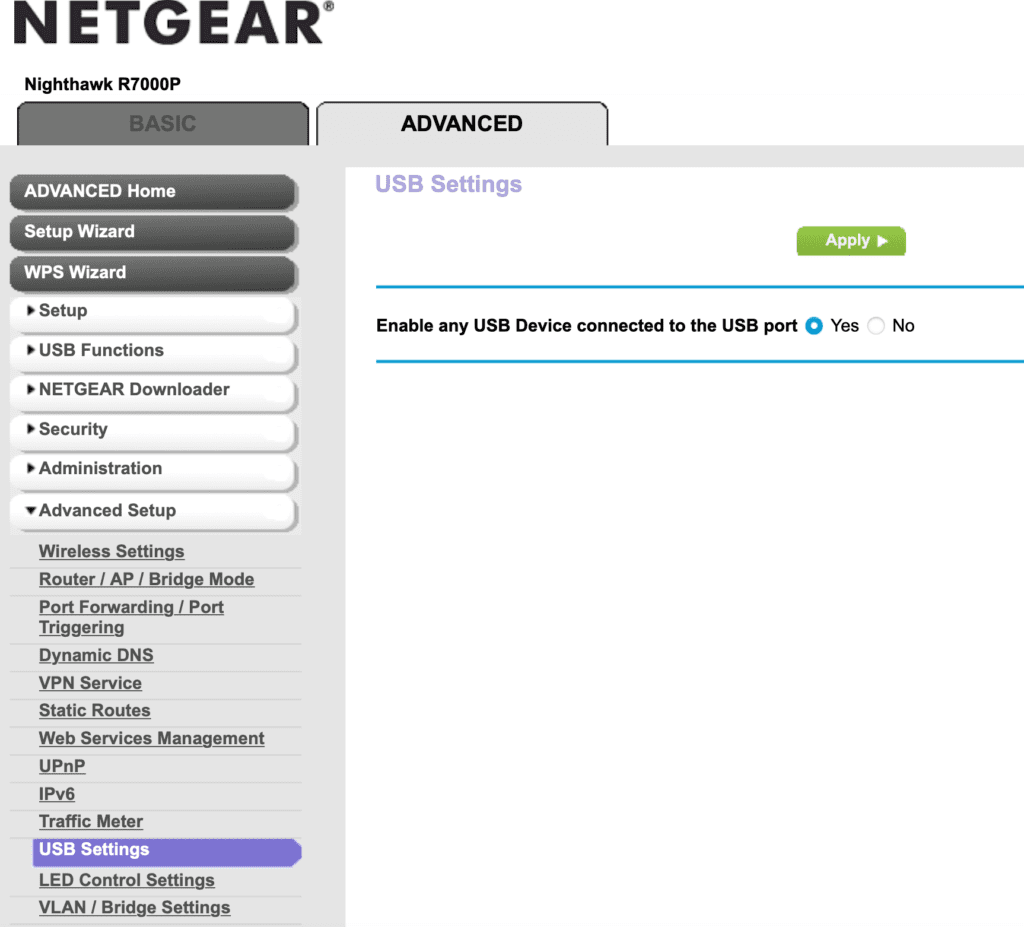 - If the printer isn’t available check router settings: Access router settings again as described above. My router and many others have an option to print wireless using their software, which I didn’t want. For Netgear, this is ReadySHARE as seen below. I instead double-checked the USB settings in Advanced setup to ensure USB devices are allowed.
